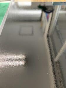 お客様の自動車に塗装されていた塗膜に近い感じでした。少し塗膜が波うっているように見えるのがお判りいただけますでしょうか?蛍光灯や窓の枠もくっきりとは映っていません。