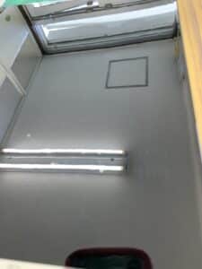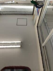 天井に反射している蛍光灯を見ていただいても分かる通り塗膜がボコボコしているのがわかります。窓の枠等も艶消しみたいになっているのがわかります。塗膜はザラザラです。
