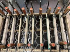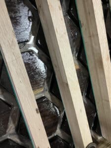 なぜ抑えるかといいますとパーツが浮いてくるんです。前回製作した時はパーツを抑えていなくてレジンの表面に木が出ている状態で仕上がっていました。